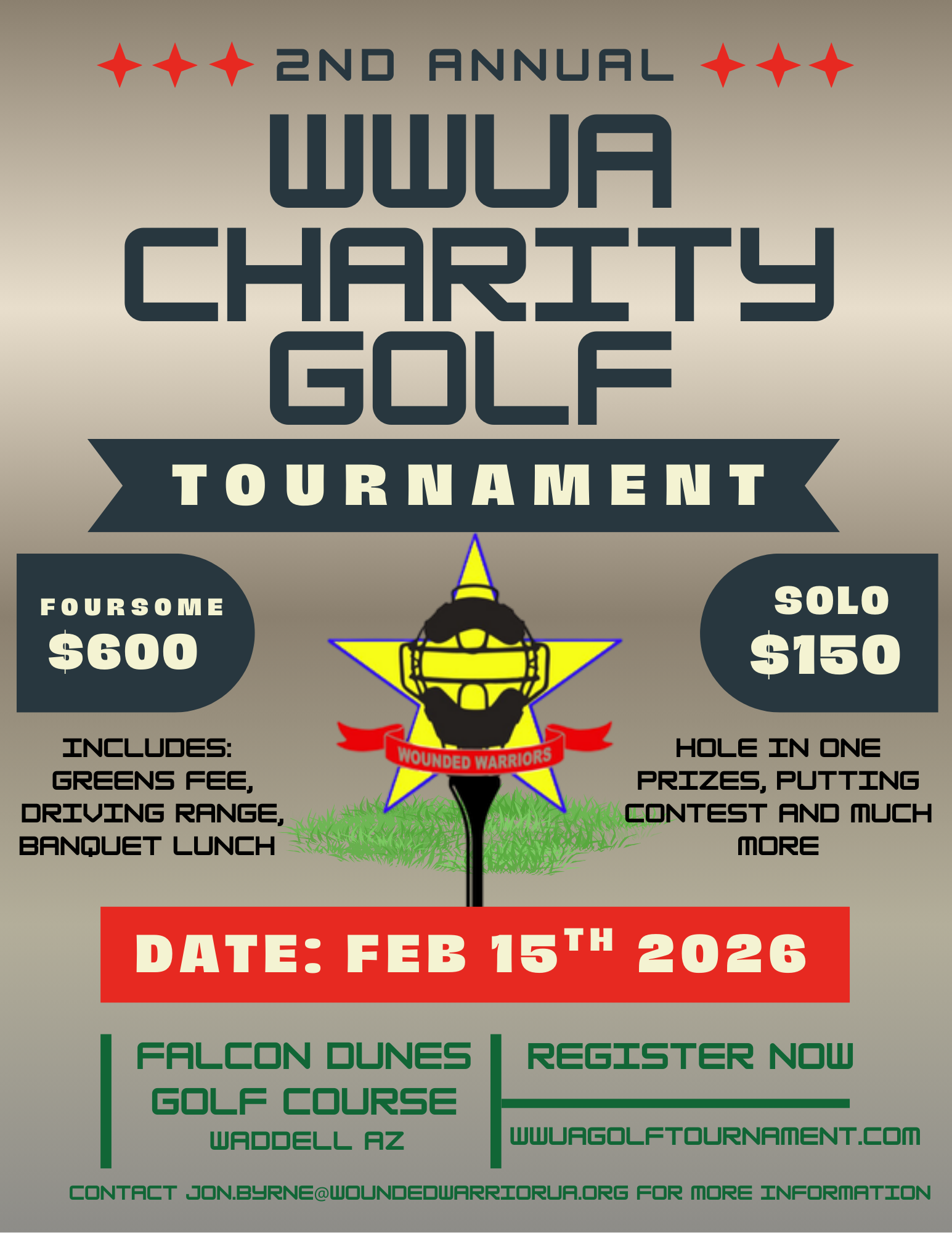 Date: February 15th, 2026Location: Falcon Dunes Golf CourseCost: $150/per player, $600/ per Foursome (Includes greens fee, driving range, banquet lunch, hole in one prizes, putting contest and much more!)Time: 7:00am Registration, 8:00am Shotgun StartFormat: ScrambleThis event is for the non-profit organization called the Wounded Warrior Umpire Academy that serves wounded veterans all across the US.