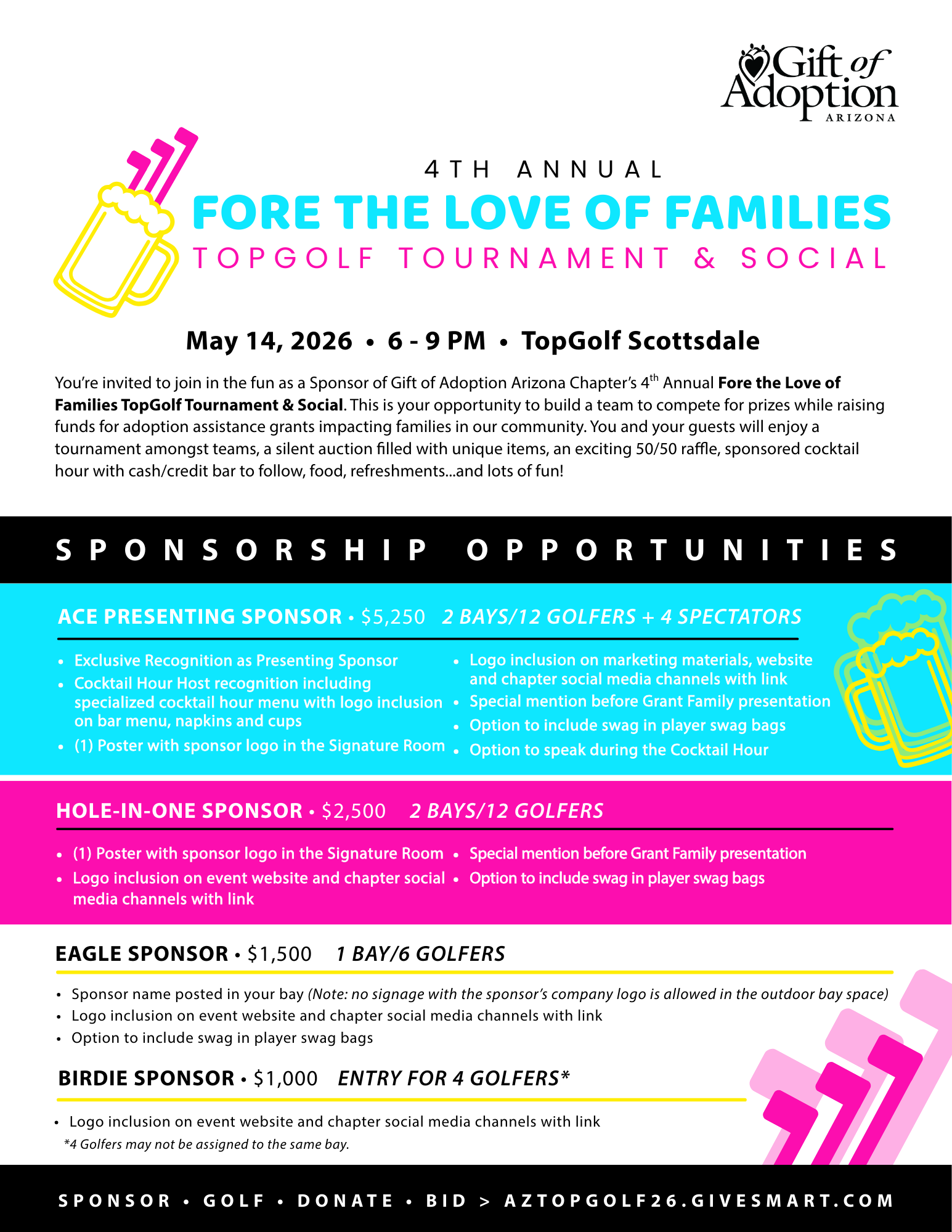 Gift of Adoption invites individuals and corporations to participate in this important work; every dollar we have to give to a family in need is a dollar we first receive from people like you! Please join us at our 4th Annual Fore the Love of Families TopGolf Tournament & Social to help us raise funds for families in Arizona seeking to complete their adoptions.